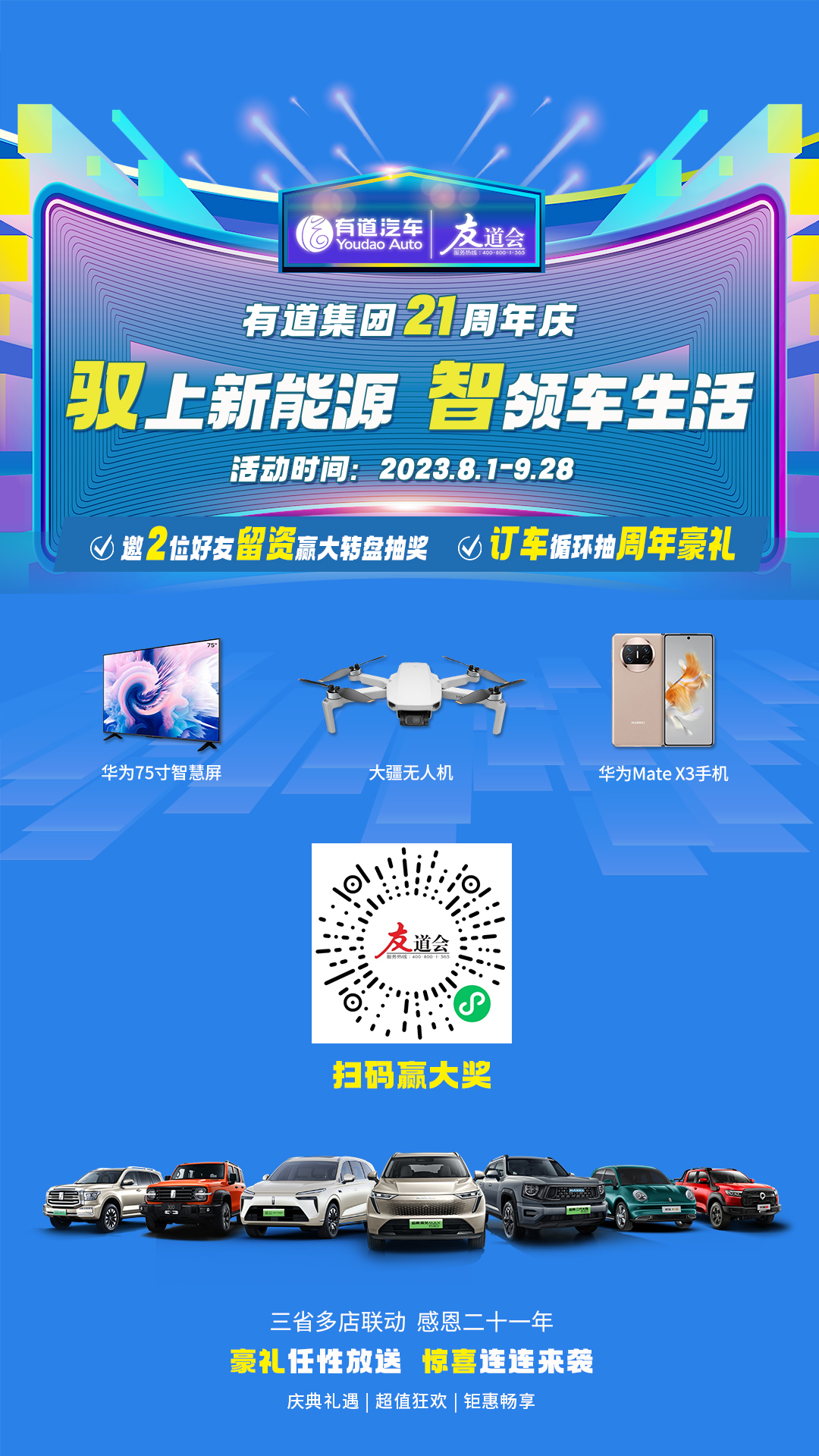 2023年是有道集團向“智能新能源汽車”戰(zhàn)略轉型元年,隨著哈弗品牌、魏牌、坦克品牌“新能源”多款火爆新車逐步上市,有道軍團重新出發(fā),挺進新能源市場,推出主題為“馭上新能源?智領車生活”有道集團21月周年慶,引領新老客戶進入全新“智能車生活”。