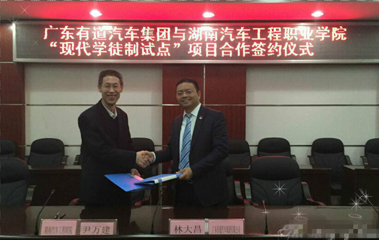 2015年1月25日,集團(tuán)董事長林董與湖南汽車工程職業(yè)學(xué)院尹萬建副院長簽訂“現(xiàn)代學(xué)徒制試點(diǎn)”項(xiàng)目合作協(xié)議