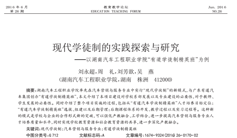 2016年6月18日,項(xiàng)目班老師劉永超、周禮、劉芳歆、吳燕在《中國教育教學(xué)論壇》期刊發(fā)表“有道精英班”為例的研究文章