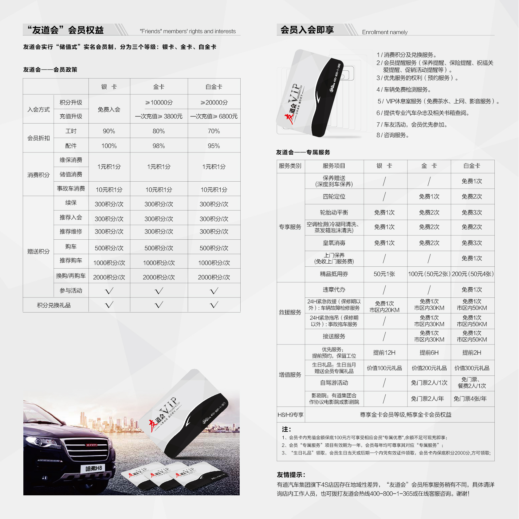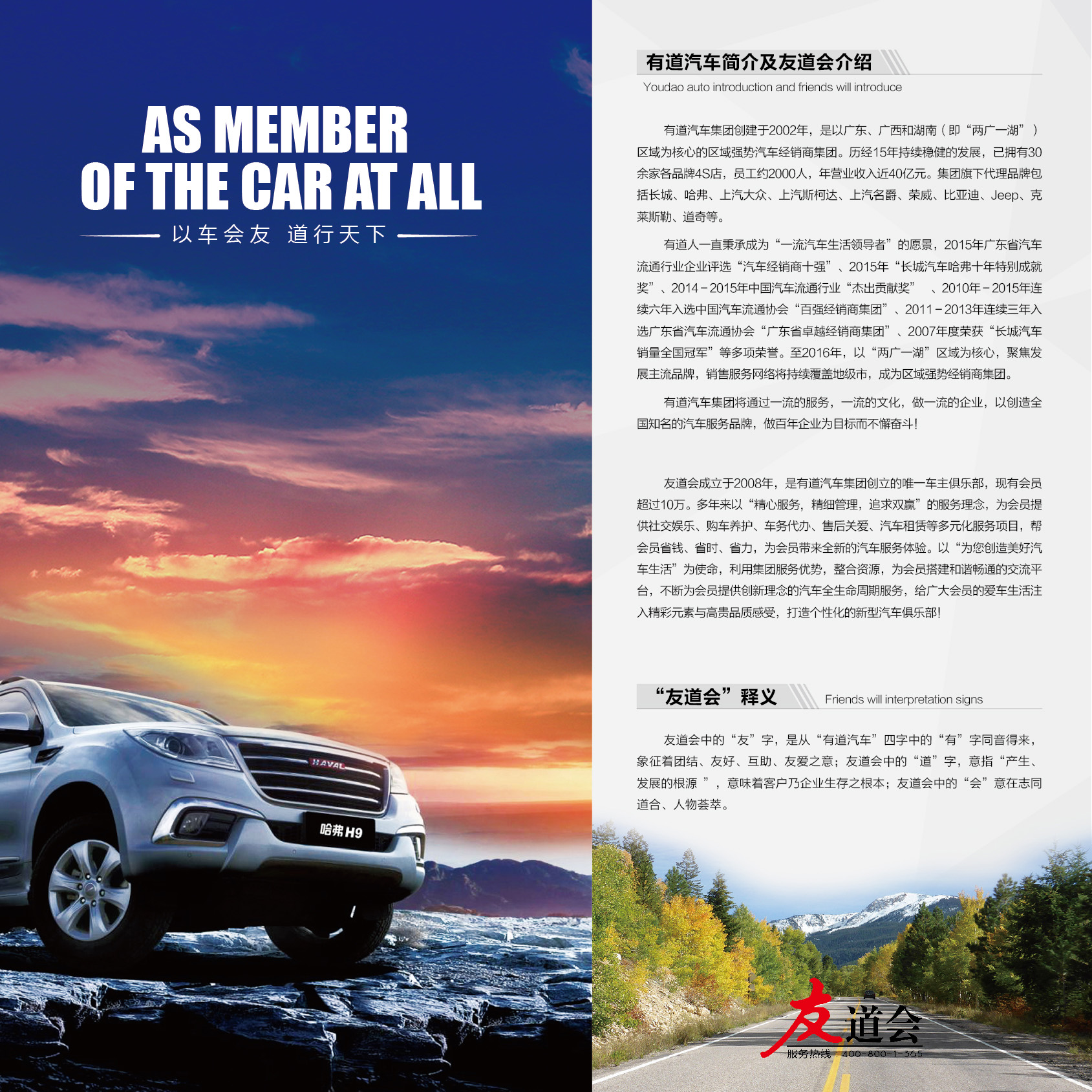 友道會成立于2008年,是有道汽車集團(tuán)創(chuàng)立的唯一車主俱樂部,現(xiàn)有會員超過25萬。多年來以“精心服務(wù), 精細(xì)管理,追求雙贏”的服務(wù)理念,為會員提供社交娛樂、購車養(yǎng)護(hù)、車務(wù)代辦、售后關(guān)愛、汽車租賃等多元化服務(wù)項目,幫會員省錢、省時、省力,為會員帶來全新的汽車服務(wù)體驗。以“為您創(chuàng)造美好汽車生活”為使命,利用集團(tuán)服務(wù)優(yōu)勢,整合資源,為會員搭建和諧暢通的交流平臺,不斷為會員提供創(chuàng)新理念的汽車全生命周期服務(wù),給廣大會員的愛車生活注入精彩元素與高貴品質(zhì)感受,打造個性化的新型汽車俱樂部!