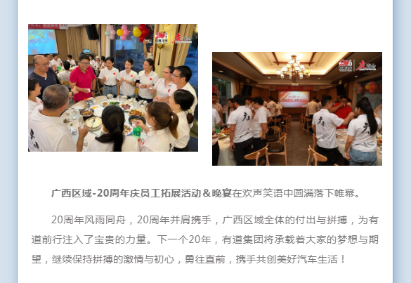 20年的汗水,20年的成就,鑄就了有道20年的輝煌。為了活躍公司職工文化生活,增強企業(yè)凝聚力和向心力,增強員工之間團結互助精神風貌,促進員工溝通交流,營造良好團隊氛圍,在有道20周年來臨之際,分別在兩廣一湖區(qū)域舉辦20周年慶員工團建活動。