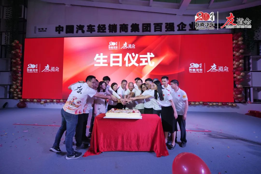 頒獎(jiǎng)結(jié)束,董事長(zhǎng)林董、馬董與多位領(lǐng)導(dǎo)一同上臺(tái)切蛋糕,舉杯同慶有道20周年,并邀請(qǐng)集團(tuán)9月生日的員工一同上臺(tái)慶祝生日。