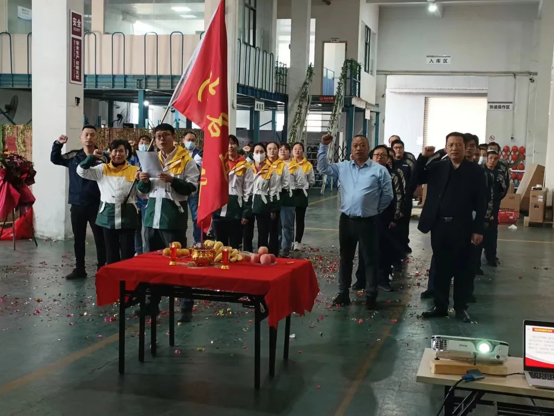 湖北名道團(tuán)隊(duì)現(xiàn)場(chǎng)授旗并進(jìn)行服務(wù)保障宣誓儀式:明確自己的工作目標(biāo)與使命,認(rèn)真對(duì)待每一份訂單,精準(zhǔn)發(fā)運(yùn)每一個(gè)備件,用心服務(wù) 每一個(gè)客戶(hù), 使命必達(dá),亮劍沖鋒!