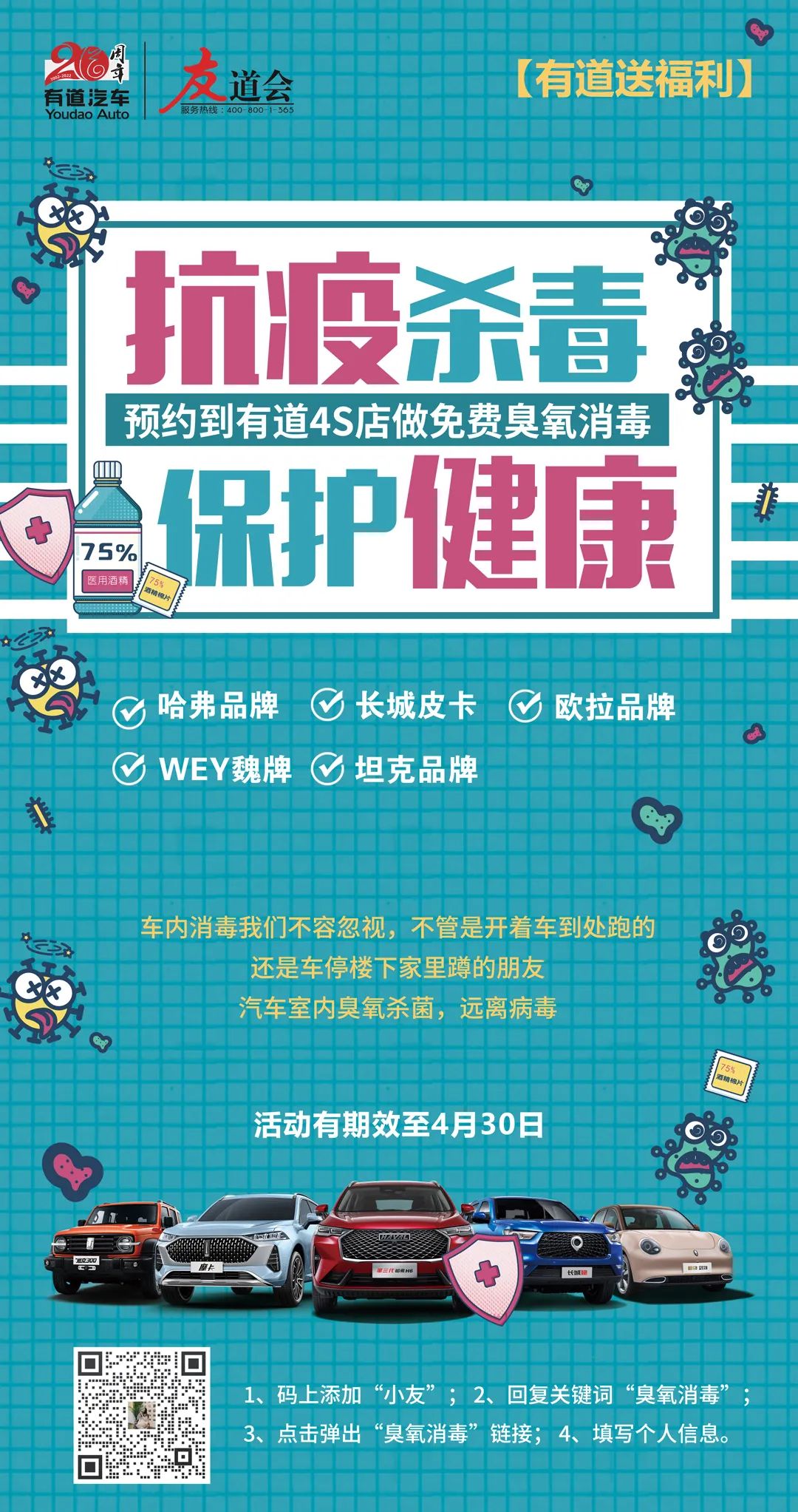 近期還有“預約到店享免費臭氧消毒”的福利活動。等解封的時候,歡迎大家到就近有道門店進行免費的愛車殺菌消毒。