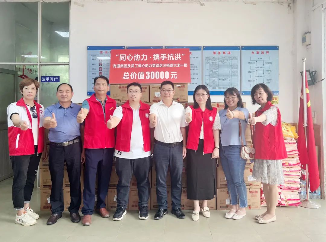 在現(xiàn)場(chǎng),有道集團(tuán)負(fù)責(zé)人與英德浛洸鎮(zhèn)鎮(zhèn)府人員進(jìn)行了物資交接,并拍攝下紀(jì)念照片。