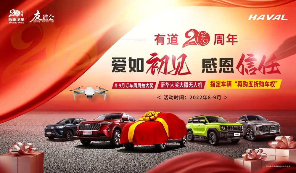 周年慶期間到店訂車尊享有道8-9月“20周年買車周周抽獎”有機會獲得無憂保險、精美禮品、汽車精品、家用電器、多臺大疆無人機、指定車輛再購5折購車權(quán)等。